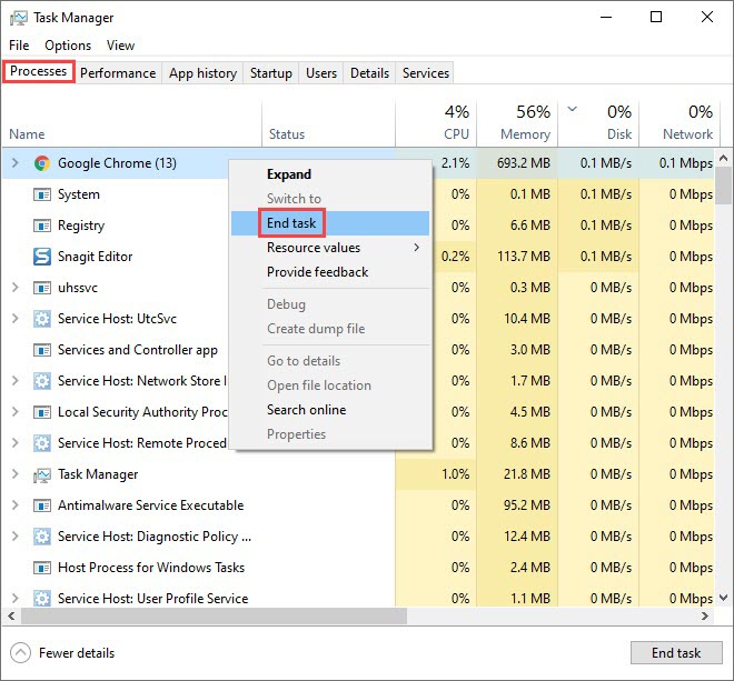 - در تب Processes، به دنبال فرآیندهایی بگردید که CPU و حافظه را درگیر می کنند. کروم را اینجا بگیرید، برای مثال، روی آن راست کلیک کنید و سپس روی پایان کار کلیک کنید.