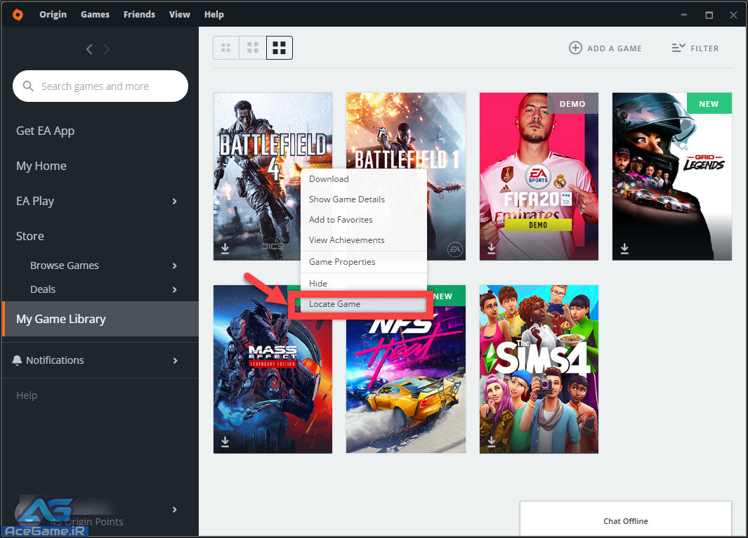 سپس روی بازی موردنظر راست کلیک کرده و مانند تصویر زیر گزینه Locate Game را انتخاب کنید.